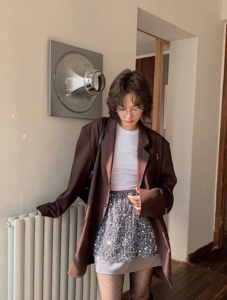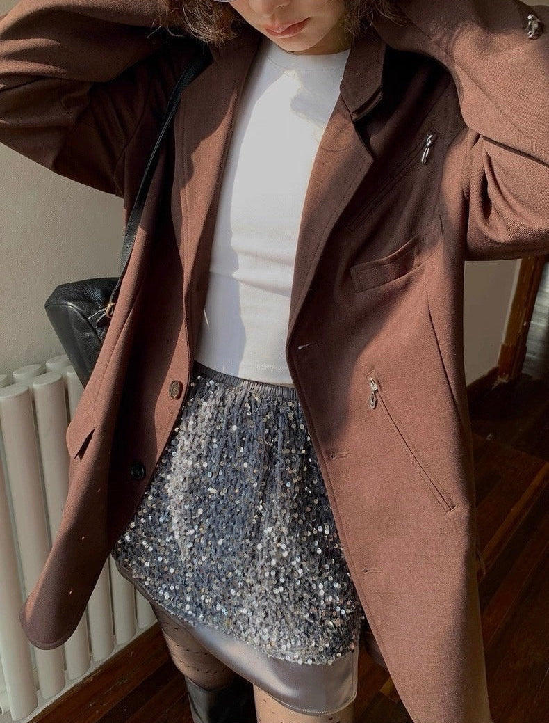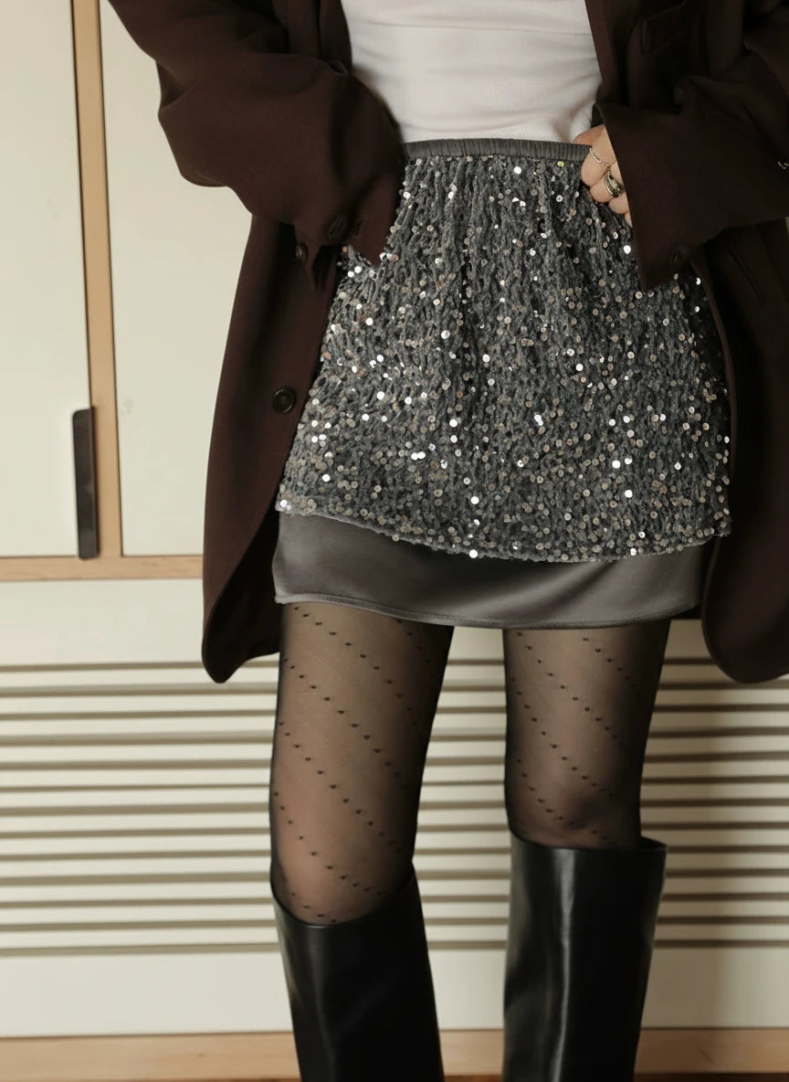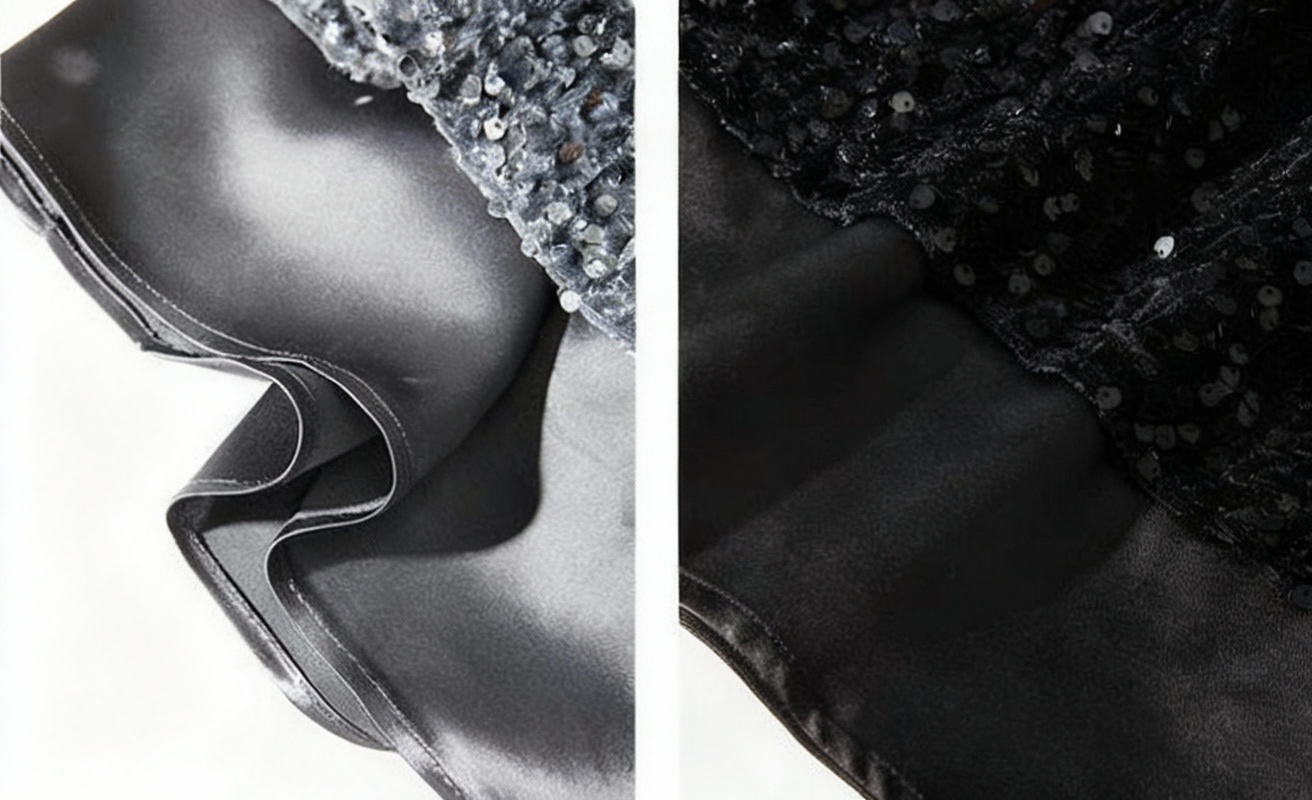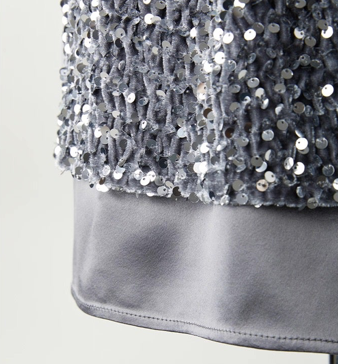 ベースには、柔らかく滑らかなベルベット生地を採用。肌に吸い付くようなしっとり感と、自然なドレープ性が魅力です。裾部分には、輝度を抑えたヴィンテージ調スパンコールを施し、上質感と落ち着いた華やかさを両立。